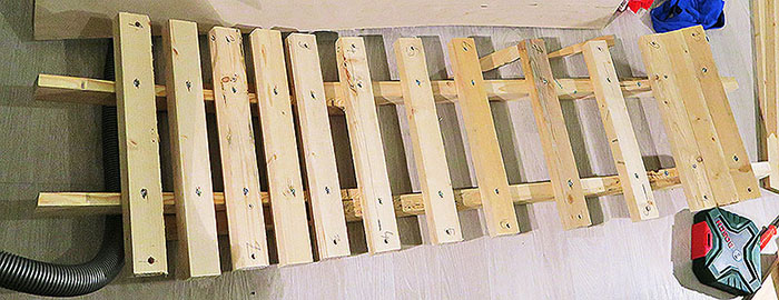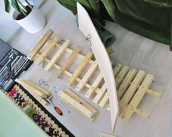 Seuraavaksi kiinnitetään 10 kpl n. 40 cm puolaa tikapuutyyliin rimoihin. Oman lautani levein kohta on 31cm joten 40 cm rimat riittävät.