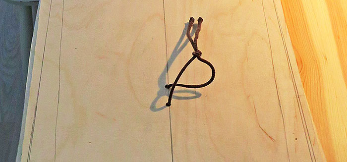 Keskilinja aihiosta etsitään viimeistään nyt. Piirsin sapluunalla laudan muodon molemmille puolin keskilinjaa.