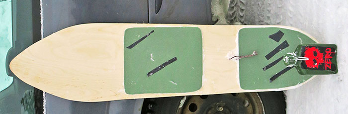 Testasin kaksinkertaista retkipatjaa etujalan alle, ei toiminut, lauta meni tunnottomaksi. Ylemmässä laudassa on pitkittäin korotukset (tuplapatja) etujalan alla laudan reunoissa,