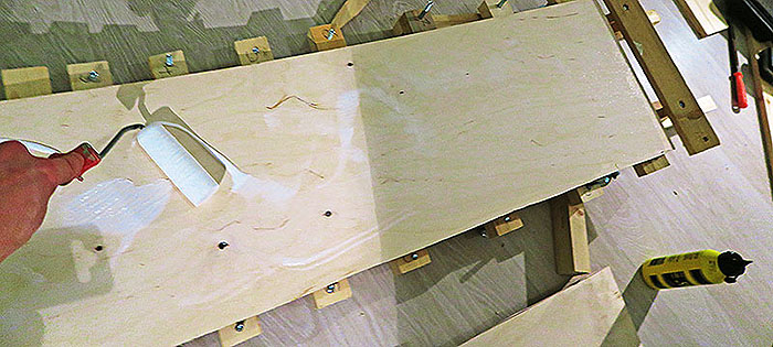 Sitten levitin liimat vanereiden molemmille pinnoille. Ensin kahteen päällimmäiseen levyyn ja pujotin karkuremminkiinnikkeen rei'istä.
