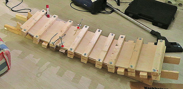 - Jos käytät 1mm viiluja, puristuksia tarvitaan huomattavasti tiheämmin ja aluslevy prässiin suotava. 4mm levyistä tehtynä n. 10 rimaparia riitti..