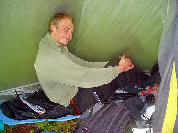 teltassa on lämmintä ja mukavaa, teltan ulukopuolella pimmeys ja kylymää..
