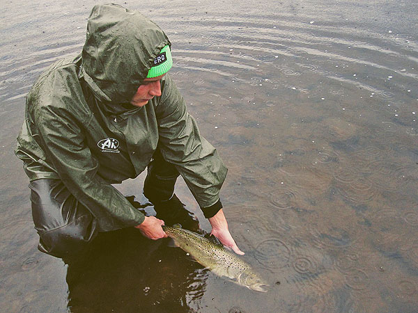 Sihverin ensimmäinen merireissun tehnyt lohi. Ikävästi vain mahasta tarttunut. Uros 59cm.
